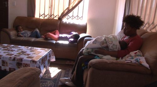 Banele’s young sisters are at home. They have not yet started formal schooling and do not go to a creche or pre-school. They lie on the couch – moving about at times, aware of the camera and sometimes making eye contact with the filmmaker. Other times they seem to sleep. Banele occasionally wriggles in the blankets, or wakes slightly and then goes back to sleep.
