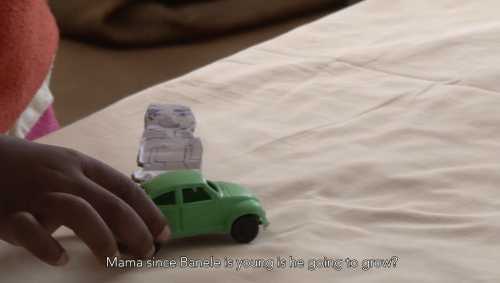 Banele is lying on his mother’s chest, having eaten. Nomusa is trying to get him to burp before letting him sleep. She pats and rubs his back. She looks tired and almost falls asleep holding him. The nanny (referred to as "Auntie") is pouring water from cup to cup to cool it in preparation for making more milk. Banele’s two young sisters play in the background with a homemade house and cut-out cardboard doll – trying to fix something which is broken and asking mom about how Banele will grow.