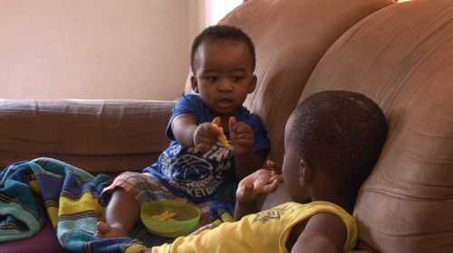 Banele and Zanele are sitting on the couch, Banele drinking from his bottle which is almost empty. Banele grunts holding out his hand with the bottle in it. “Auntie”, a new housekeeper, brings him a replacement bottle. Zanele watches from the side. “Auntie” brings a small bowl of chips (crisps) for Banele, who picks out a couple and begins to eat. Zanele stretches her hand to take one from the bowl but Banele stops her with his hands and another grunt. Banele looks at Zanele then into the bowl then at the filmmaker, and after picks up a chip and tries to hand it to Zanele, who pushes it away.