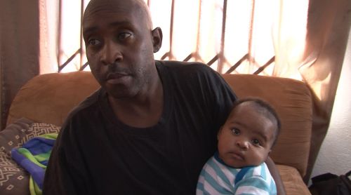 Dad is at home. He speaks about the illegal landing of a private family aeroplane at the military base at which he works on contract cleaning planes before, prompted by a comment by the filmmaker, talking briefly about Banele’s growth. Dad points out to Banele who the filmmaker is. All Banele’s siblings are at home on the other sofa. Dad passes on various instructions. Banele becomes restless and begins to cry. Dad tries different ways of soothing him before lying Banele on dad’s lap on his back. Banele settles and lies there for a while. Dad falls asleep in this position, head bobbing as he does.
