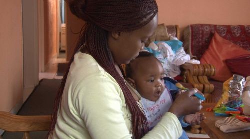Mom pick Leago up and faces him towards the TV and starts to feed him. He stares ahead. He eats and swallows more easily than some of the previous solid feeds. Mom comments (in Afrikaans) “You know ‘Purity’. You understand ‘Purity’ – referring to the food brand.
