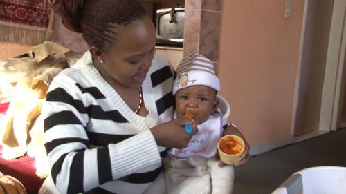 Leago is in his washing basket and mom starts to feed him a new food. He reacts to the first taste of it – lips contorted, tongue exploring. Mom takes him out of the basket to feed on her lap. Leago wriggles around, mom trying to get him to eat without putting food on her jersey. Mom and granny discuss why it is so hard to feed him, “that’s why I asked you to feed him. You think I’m crazy” mom says. Leago is handed to granny to continue feeding. Granny turns the eating into a game, making funny noises. While Leago gazes up at her granny puts food into his mouth. But he does not settle into an easy feeding. Granny stands him up against her and his hands explore her face. She chastises him but he smiles and continues. Mom returns to the room and Leago is put into his basket for mom to finish feeding him. Leago shows mom that he does not want to eat.