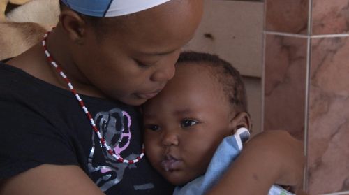 Mom is feeding Leago. Granny and Naledi are also at home. Everyone is watching a TV programme. There is little conversation. Mom feeds Leago while he sits up on her lap. They share spoonsful of porridge. Mom makes sounds towards Leago and he gazes at her. He plays with her necklace. Mom then puts Leago into his walking ring. She sits to watch a TV episode she says they missed yesterday. Leago also stares at the TV.