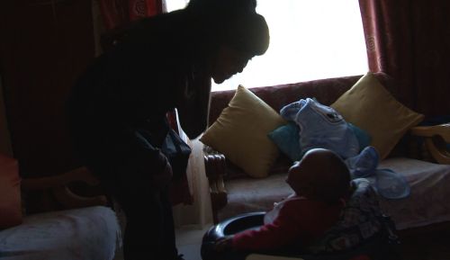 It is early evening. Leago is in his walking ring, watching TV with granny. She comments about how much he loves the TV. Granny hears mom arriving home from work and unlocking the gate. Leago manoeuvres himself quickly to the door, squealing and smiling. He gets a hello kiss and follows mom to the bedroom. They return to the living room and to the TV. Leago still in his ring, starting to cry slightly. He is picked up out of the walking ring and starts to feed. “He likes the breast”, granny comments. Mom and granny continue a conversation about the day while Leago feeds, often gazing up at mom, who returns the gaze between looking at granny. While suckling, Leago reaches up to mom’s mouth and touches her. She responds, kissing his hand. When he is finished eating, mom sits him up and he snuggles against her. Mom, wanting to change out of work clothing, puts Leago down on the floor and unravels a toy for him. Leago watches as she does this. “He’s never seen you do this before”, granny comments.