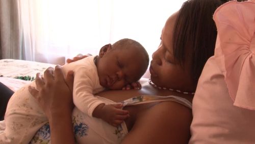 Leago is emerging from his sleep, mouth moving and body stretching. Still sleeping he begins to cry. Mom arrives to sooth and feed him. He is undressed and bathed while mom talks to him. While being dressed Leago wees and mom expresses her irritation at him. Once dressed Leago feeds and although he doesn’t burp mom holds him for a long while until he sleeps.