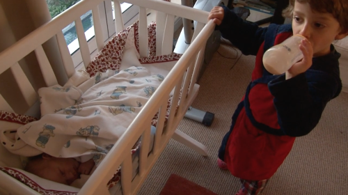 Dad is involved but tired. He incorporates new baby into siblings discussion and introduces cot’s history.