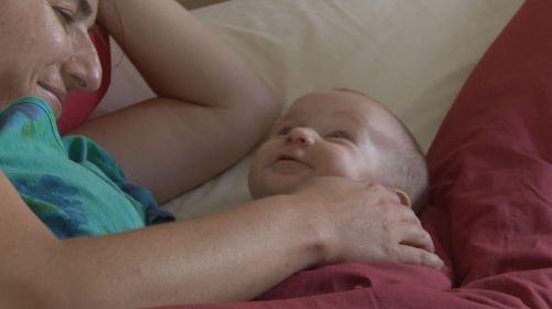 Sofia is in mom’s arms as she is carried upstairs to mom’s bedroom to feed. Mom puts Sofia down on the bed and climbs in, covering both of them with a duvet. While mom is preparing to feed, Sofia turns towards the breast, ready to suckle. The filmmaker cannot see Sofia on the breast, but the sounds of her feeding are clear. Mom looks off into the distance. Sofia’s arm appears several times from under the duvet and moves about, touching mom’s arm before settling on mom’s clothing and holding her. This happens a few times before mom takes Fia’s hand. Sofia stops feeding and looks up at mom and smiles. Mom returns the smile and they hold their gaze of one another until Sofia returns to the breast.
