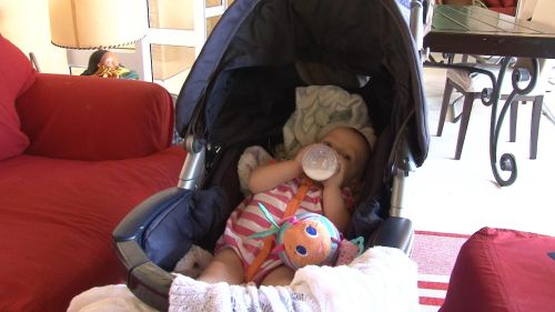 Nomsa picks Sofia up and feeds her from the bottle. This is the first time we see Sofia drinking from a bottle – but she does not settle. Nomsa places Fia back into the stroller and pushes the stroller back and forth. Sofia is sitting up and is not soothed by the movement. She gets agitated and begins to cry. Nomsa drops the back of the seat into a lying position and gives Sofia her bottle. She is holding the bottle herself and feeding, swallowing deeply, as the stroller is pushed more gently back and forth.