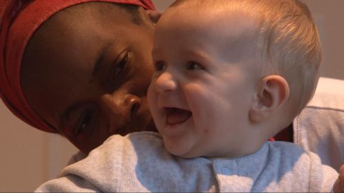 Sofia is playing alone in Luca’s room. Shirley enters and starts asking Sofia what she’s doing. Sofia tries to drag herself towards Shirley but struggling, begins to cry. Shirley picks her up and they sit together on a child-sized chair. Shirley holds Sofia towards the camera as well as facing her. They interact closely with Sofia making sounds that Shirley mimics. Both laugh and smile. A car passes on the street below. Sofia, hearing the car, looks towards the window and gestures with her hands. This is where mom and dad’s cars would arrive home. Sofia lifts her shoulders and Shirley responds saying “Tata, Tata [bye-bye]”. There are times in the playing where Sofia seems to be waiting for an expected action. When it happens she laughs. There are other times where her expression is less easy to read and is a mix between pleasure and uncertainty.