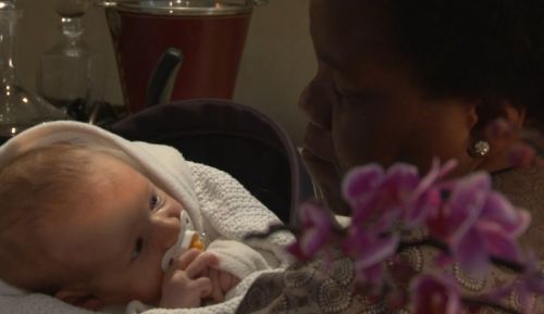 After being bathed Sofia is in her pram (stroller) and starts to cry loudly and for a long while. Nomsa picks her up and holds her while sitting. Sofia looks for eye contact with Nomsa – which is sometimes met and sometimes not. Nomsa comments after a long while to Sofia that she had just wanted to be held. Nomsa puts Sofia back into the pram.