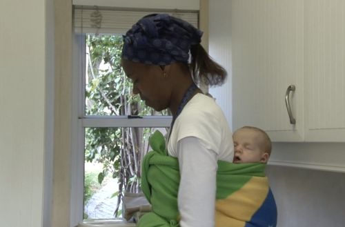 Sophia is asleep, wrapped in a blanket on Shirley’s back, while Shirley irons. Sofia is placed in her stroller and sleeps and wakes for a while before starting to cry. She waits for several minutes between cries, listening for responses. After Sofia crying loudly, Shirley arrives and gives her the pacifier. At some point Shirley picks Sofia up and interacts uncomfortably with the filmmaker and camera before returning her to the stroller.